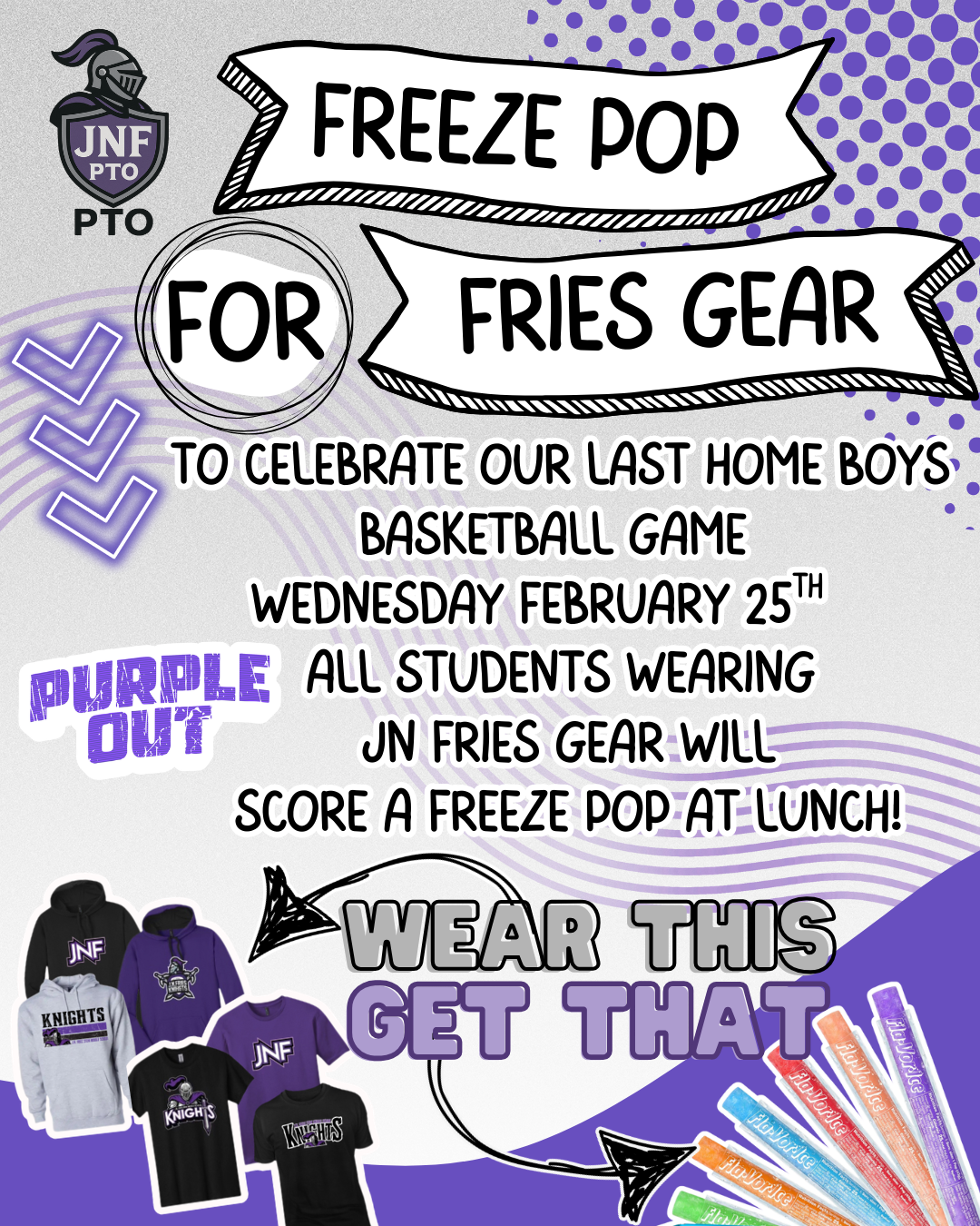 To celebrate our last home basketball game Wednesday: PTO will hand out Freeze pops for FRIES gear at lunch!Wear any JN Fries Shirt and get a Freeze pop! Purple JNF shirts on sale for $7 for PURPLE...