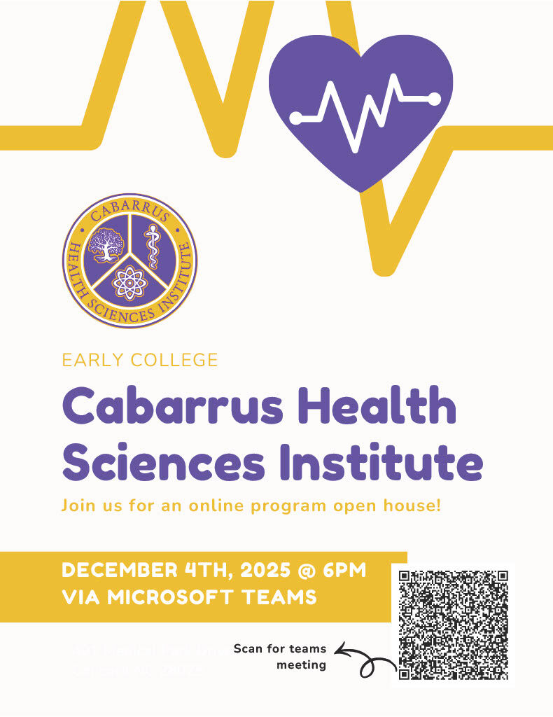 Program Choice Virtual Open House for the Cabarrus Health Sciences Institute Early College is Dec.4th at 6 PM via TEAMS.