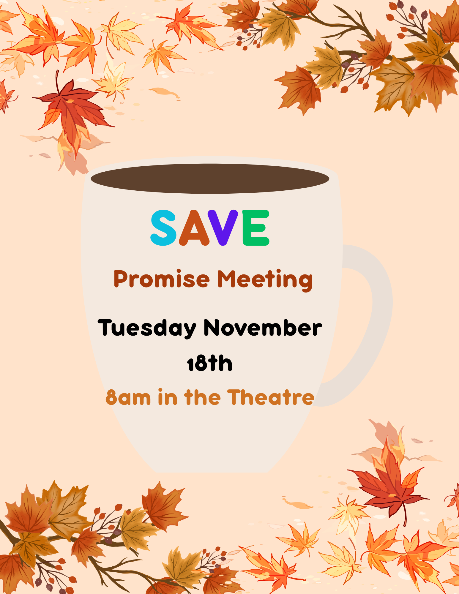 SAVE Promise Club will meet tomorrow at 8:00 AM in the theatre room.